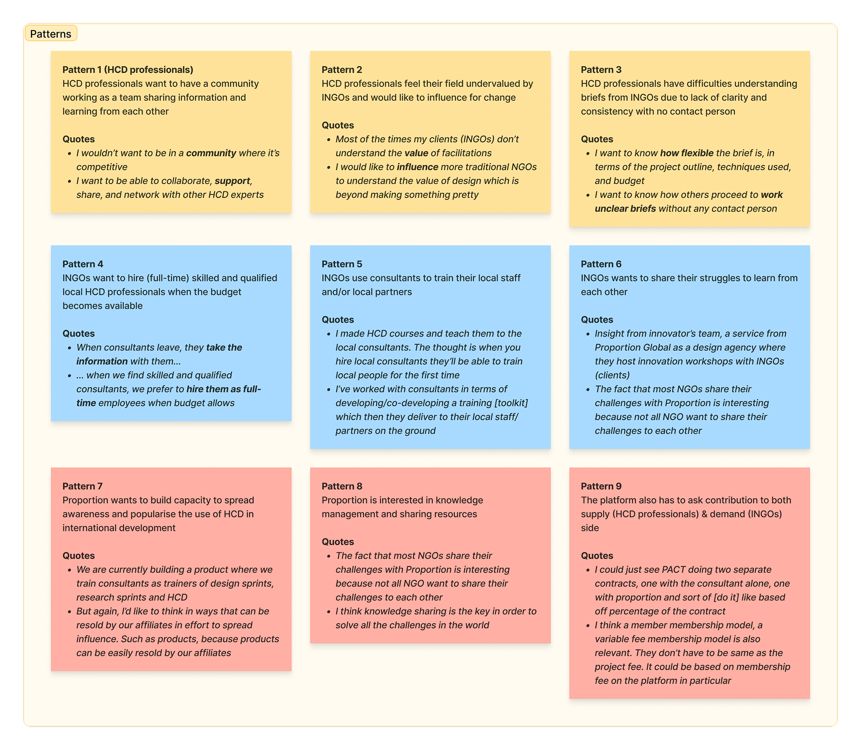 Patterns were identified and formulated using a synthesis board through brainstorming, affinity diagramming, and dot voting in collaboration with Proportion Global members. Through the patterns, 3 key insights were formulated.
