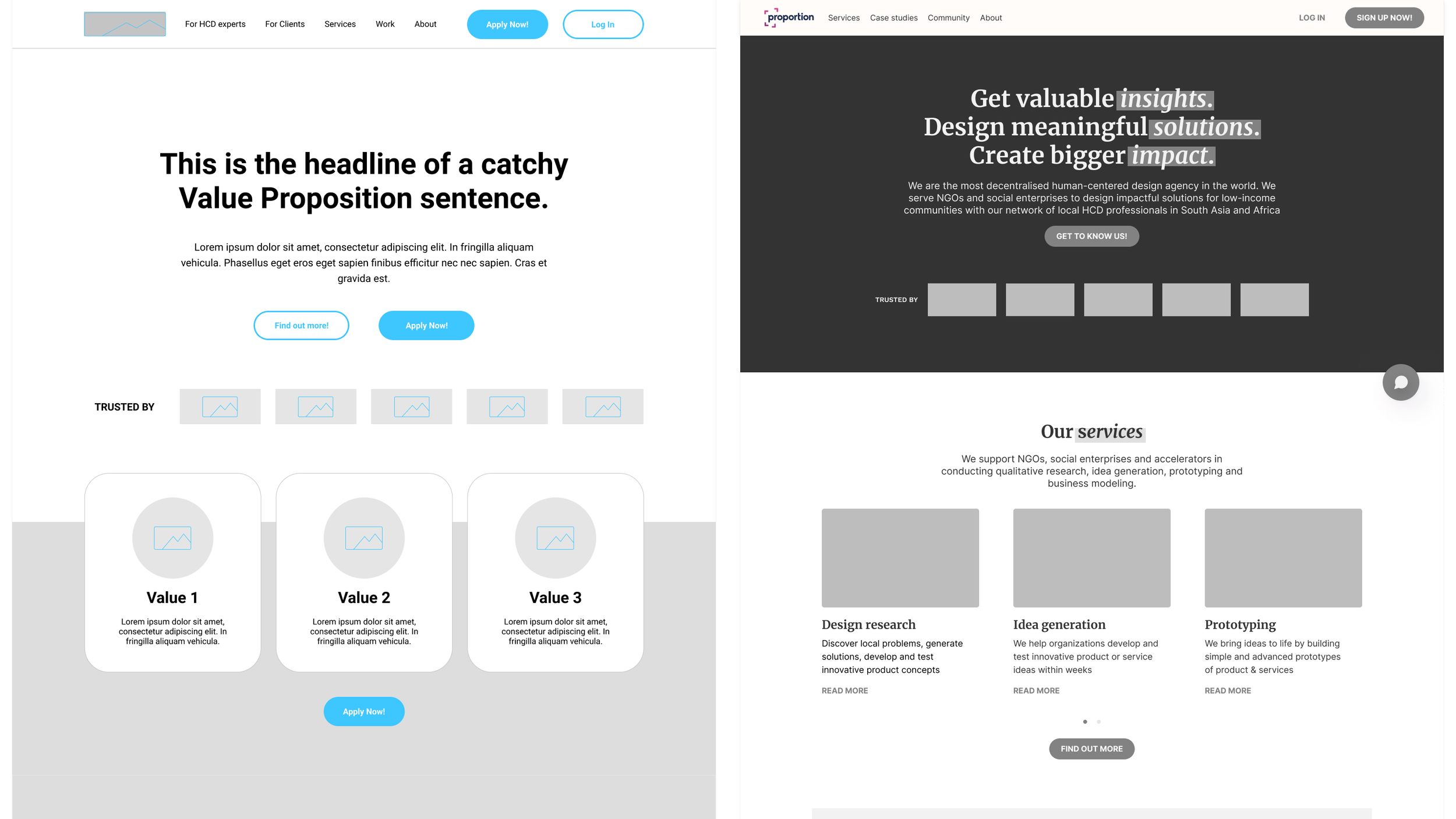 Their familiarity with brainstorming techniques and HMW questions accelerated idea generation. Dot-voting and affinity diagramming clustered similar ideas to avoid duplication. Clusters were reviewed for user relevance and prioritised using an impact-effort matrix, focusing on high-impact, low-effort concepts. The final product includes the Proportion Website redesign and the HCD Community Platform.